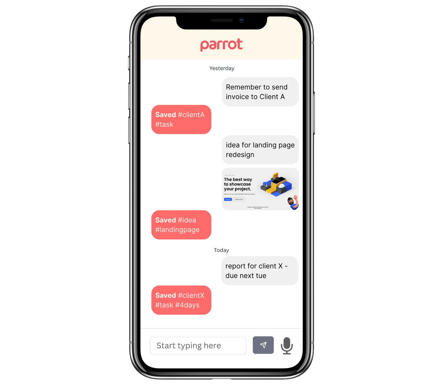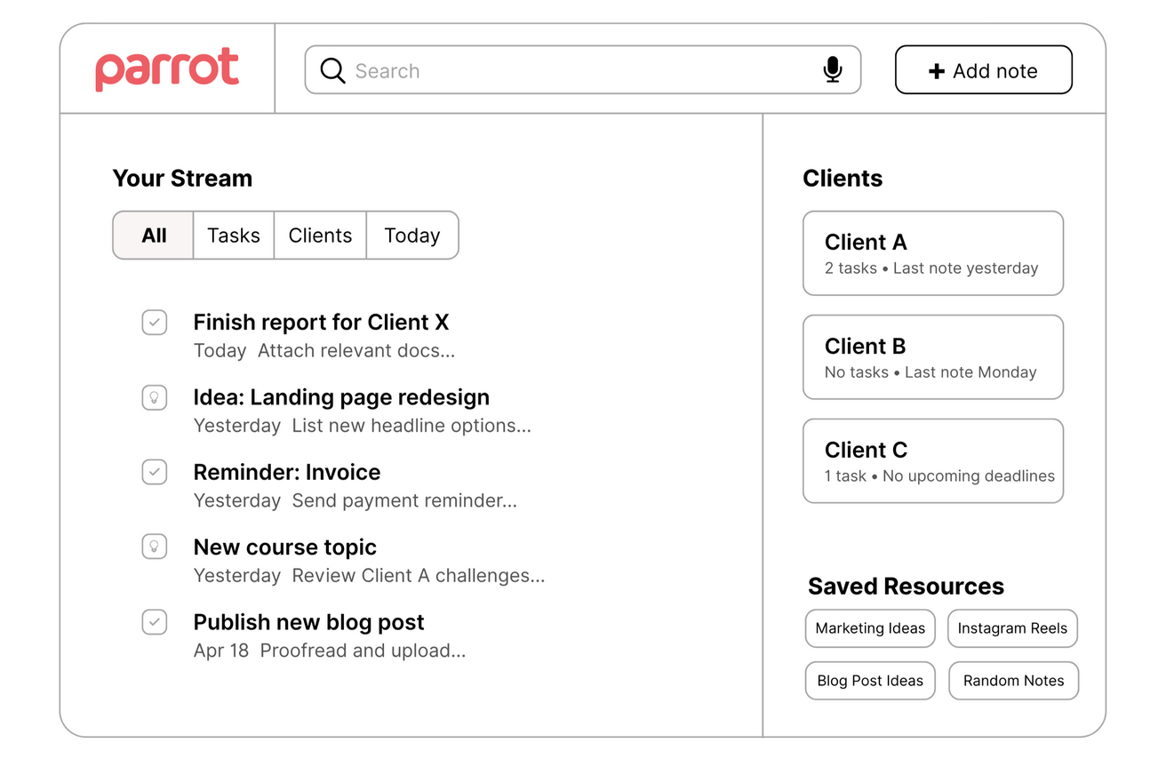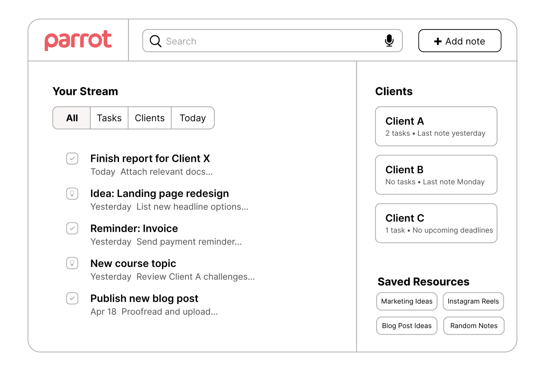 Parrot brings order to your notes, tasks, and ideas, without the setup or templates. Just save, and we'll sort and provide insights for you.